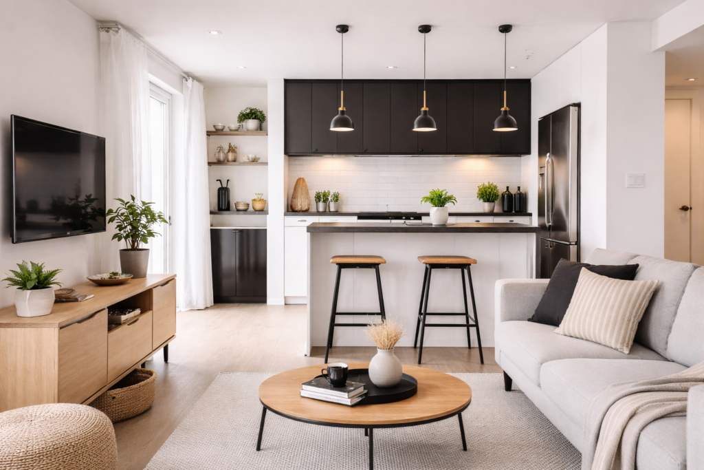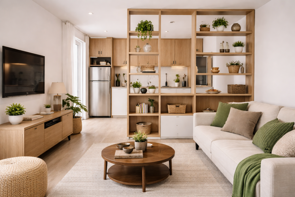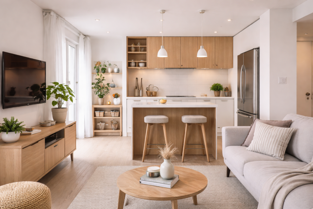 Em apartamentos compactos com sala e cozinha integradas, a organização da sala faz toda a diferença para manter o ambiente funcional.